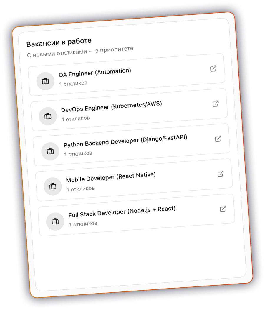 Сервис сам проверяет кандидатов по заданным критериям и выдаёт рекрутерам только релевантных соискателей, уменьшая время на первичный скрининг.